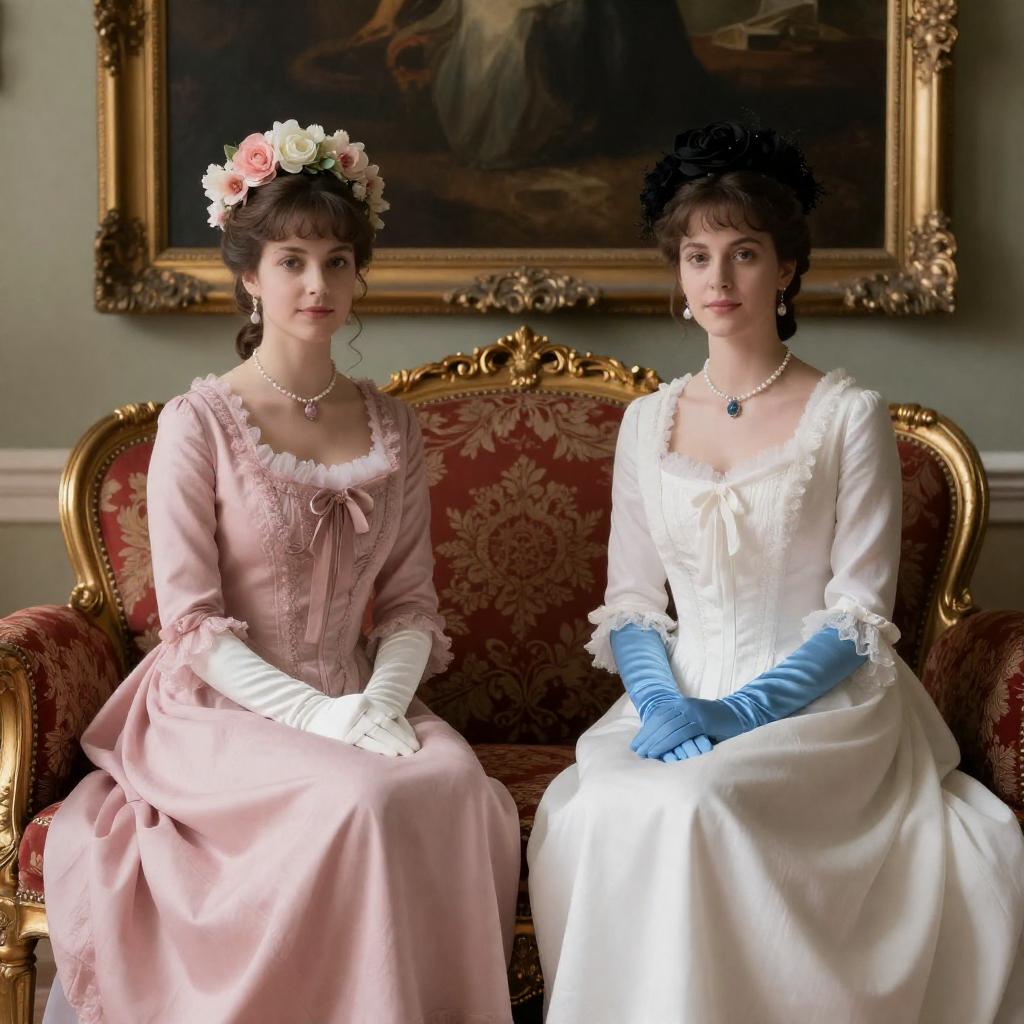 Photograph of two women in white Victorian-style dresses standing in a lush garden. One woman wears a wide-brimmed hat, while the other has short blonde hair. They are surrounded by vibrant flowers, including pink and purple blooms, and greenery. An arched stone doorway is in the background.