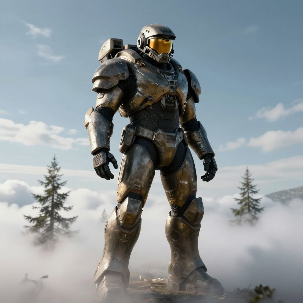 Photorealistic CGI of a futuristic, armored space soldier with reflective visor, standing on misty mountain landscape, blue sky, and pine trees.