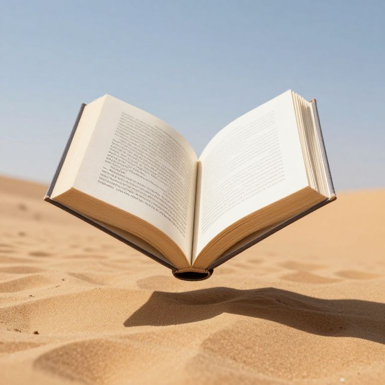 Photograph of an open book floating above a sandy desert under a clear blue sky. The book, with white pages filled with black text, casts a shadow on the golden-brown sand. The sand is smooth with gentle ripples, and the bright sunlight highlights the book's pages and the texture of the sand. The book is centered in the image, with its pages fanned out, creating a sense of weightlessness and wonder.