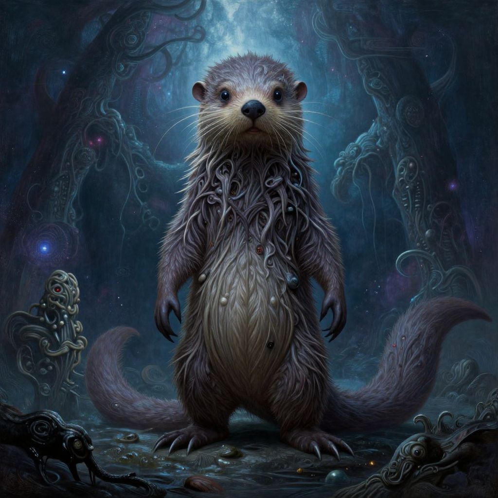 An evil sea otter god in the ocean depths, abyss, cosmic horror painting, elegant intricate digital painting artstation concept art by mark brooks and brad kunkle and beksinski extreme detail 4 k