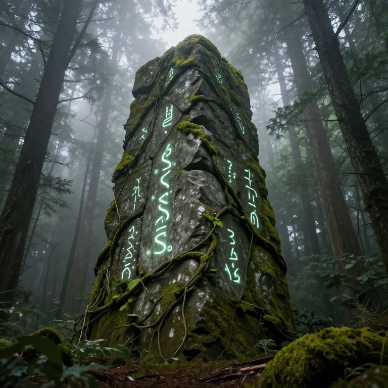 Photorealistic digital artwork depicting a moss-covered, towering rock formation in a dense, misty forest. Glowing, neon-green runes in a mysterious script are etched vertically along the rock's surface. The forest is filled with tall, dark trees, and the ground is covered in ferns and fallen leaves. Light filters through the fog, creating a mystical atmosphere. The rock's textured surface and the luminescent runes contrast sharply with the dark, shadowy forest background.