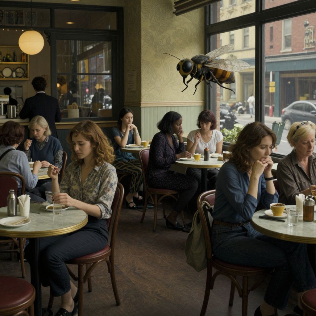 Photograph of a cozy café with six women sitting at round tables, sipping coffee, wearing casual clothes; a hanging insect sculpture above. Sunlight