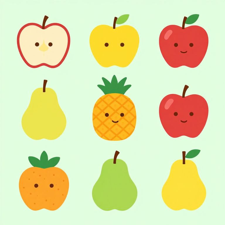 The image is a vibrant and playful illustration of various fruits, presented in a minimalist and clean vector style. The collection features eight distinct fruits, each with a cheerful and friendly expression, arranged in a 3x3 grid against a soft, pastel green background. From top left to bottom right, the fruits include a half apple, a whole apple, a yellow apple, a red apple, a pear, a pineapple, a green pear, and another pear. The fruits are depicted with simple, rounded shapes and smooth textures, giving them a cartoonish and approachable appearance. The colors are bright and cheerful, with a range of yellows, reds, greens, and oranges, creating a lively and inviting atmosphere. The overall composition is balanced and harmonious, with each fruit clearly defined and spaced evenly within the grid, creating a sense of order and symmetry. The illustration is designed to be a fun and engaging wallpaper, suitable for a variety of uses, and captures the essence of the fruits in a visually appealing and accessible manner.