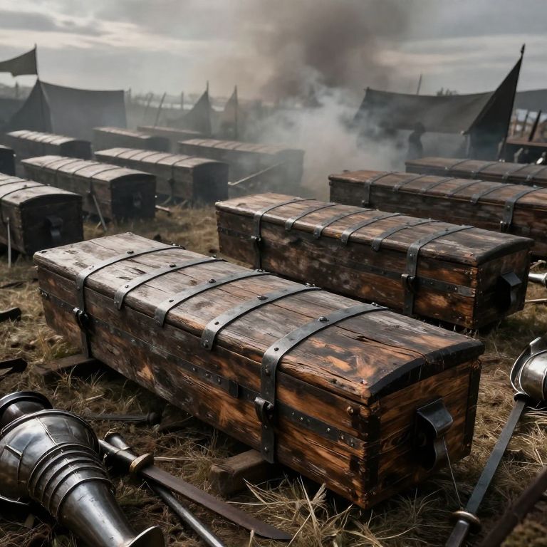 Coffins in a medieval battlefield scene, battered wood with iron bands, scattered among broken armor and weapons, smoky sky with muted colors, dramatic and somber tone, realistic style with attention to historical detail and textures.
