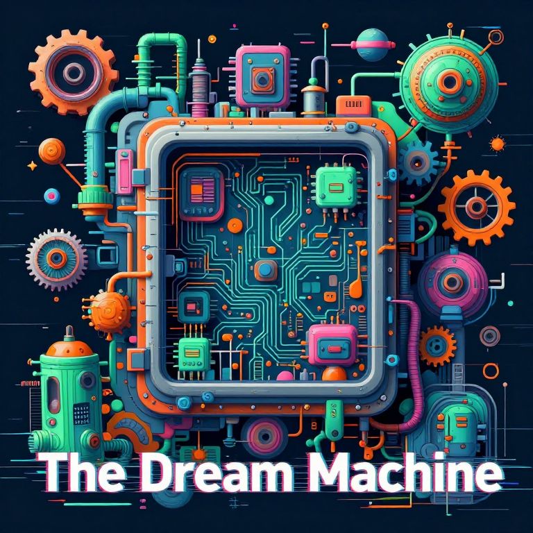 Digital art of colorful, neon-glowing, steampunk-inspired circuitry and gears surrounding a central square chip, with "The Dream Machine"