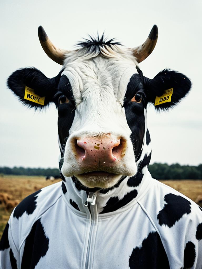 Man in Cow Suit costume, cinematic realism, humorous detailed portrait