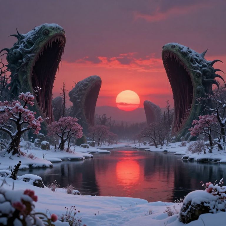 Mountainous structure composed of jagged white teeth emerges from dense clouds, its gaping maw revealing a fiery red interior as it slowly consumes the surrounding mist and releases faint star-like particles into the night sky.