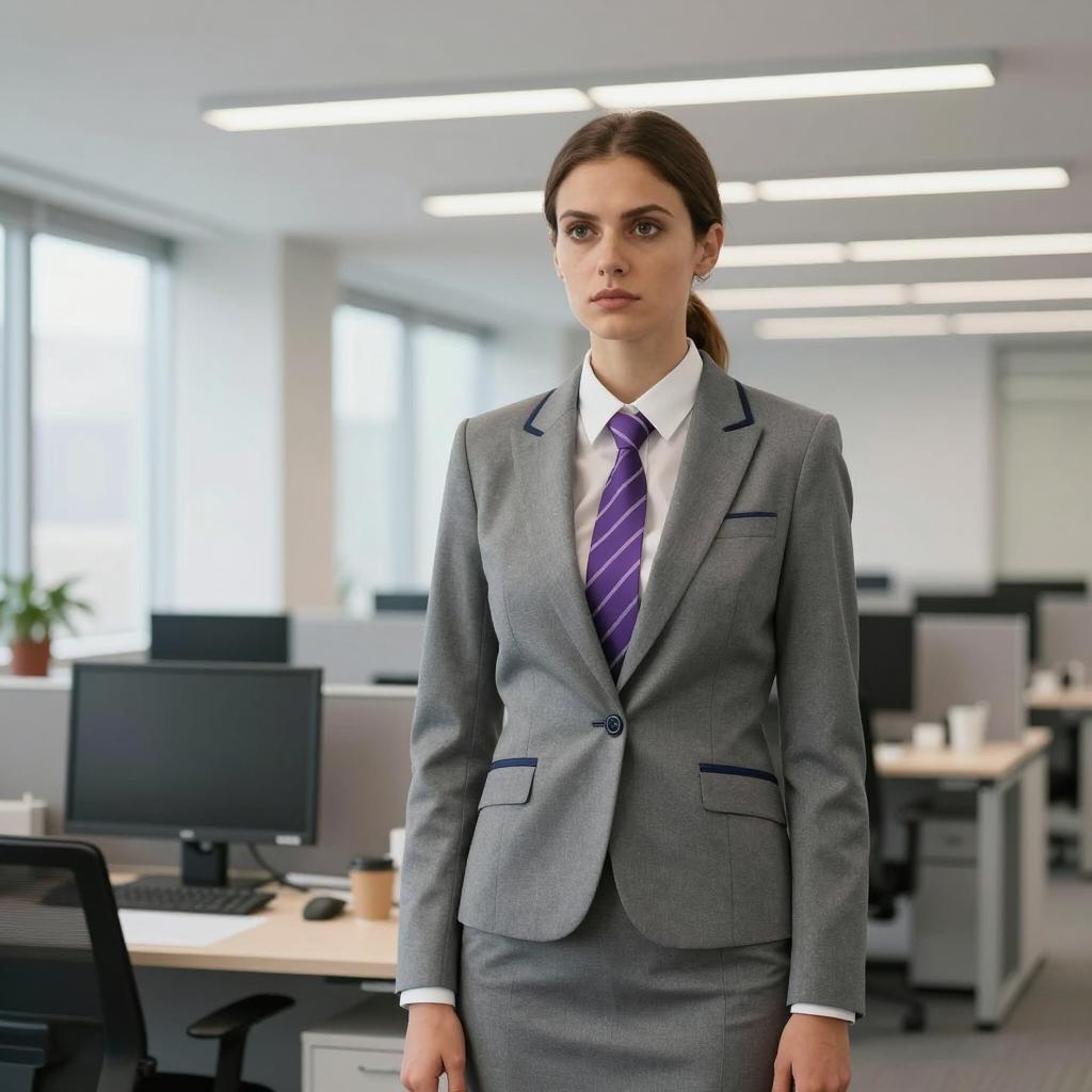 Professional office clothes, photograph of a serious-looking woman, office setting, daytime, standing in front of desks, modern office furniture, gray business suit with navy blue accents, white dress shirt, purple striped tie, brown hair tied in a low ponytail, light skin, neutral expression, fluorescent ceiling lights, large windows in background, professional appearance, business attire, realistic, clear focus, office environment, corporate style, businesswoman, formal wear, corporate office, modern workspace, professional setting