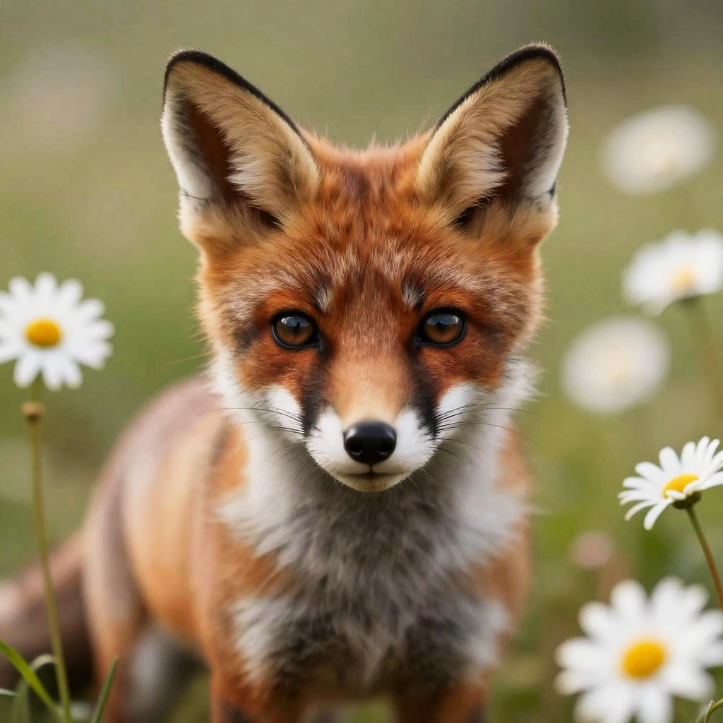 Hyperrealistic glamour photo of a cute little baby fox surrounded by beautiful daisies in a meadow, beautiful eyes, sunlight, (high quality:1.2), extremely detailed fur, masterpiece, best quality, photograph, dreamlike, face focus, intricate details, sharp focus, photography, photorealism, photorealistic, soft focus, volumetric light, (crisp morning light), (intricate details), (hyperdetailed), high detailed, lot of details, high quality, soft cinematic light, dramatic atmosphere, atmospheric perspective, raytracing, subsurface scattering