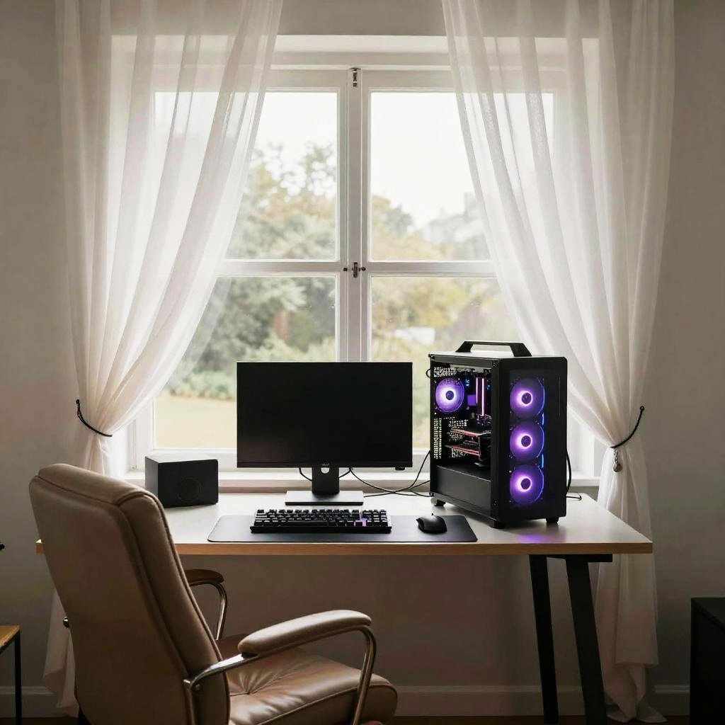 Gaming setup in front of window with forest view, wooden desk with large ultra-wide monitor, customizable RGB mousepad, gaming console, potted plants adding fresh greenery, soft daylight filtering