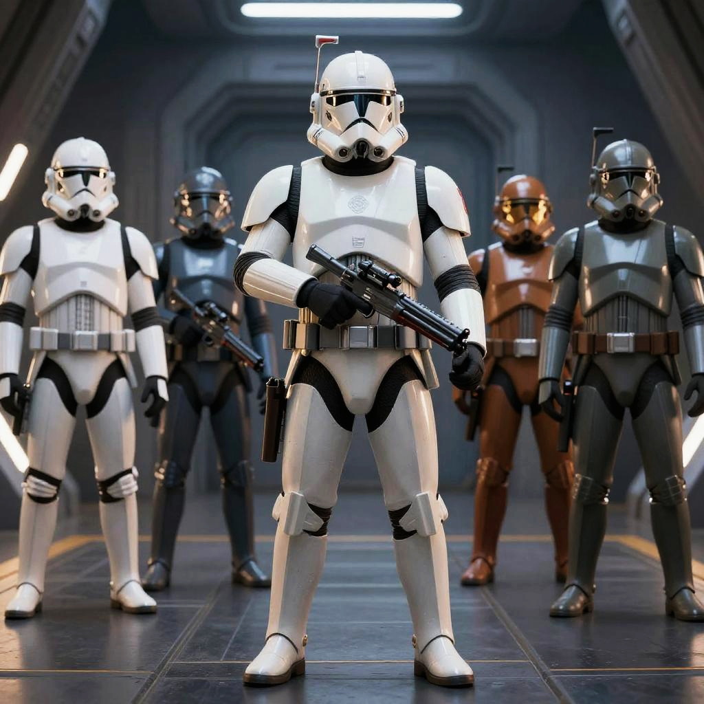 Down syndrome Star Wars rebel fighter standing strong with a blaster, surrounded by diverse squad in a starship hangar, high detail, futuristic sci-fi environment