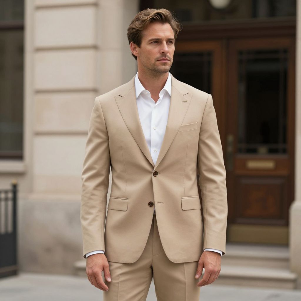 Photograph of a handsome, light-skinned man with short, brown, slightly wavy hair, wearing a beige, single-breasted suit with a white dress shirt. He stands confidently in an urban setting with a blurred background featuring a stone building and a wooden door with glass panels. The suit's fabric is smooth and tailored, and he has a serious, focused expression. The lighting is natural, highlighting his well-groomed appearance. The image has a slight, realistic, yet slightly enhanced color tone.