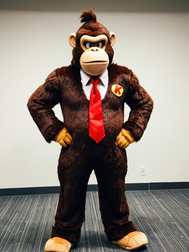 Photo-realistic cosplay photo of person in donkey kong costume. Full body. Standing. Full length. furry male, brown hair, large breasts, red necktie