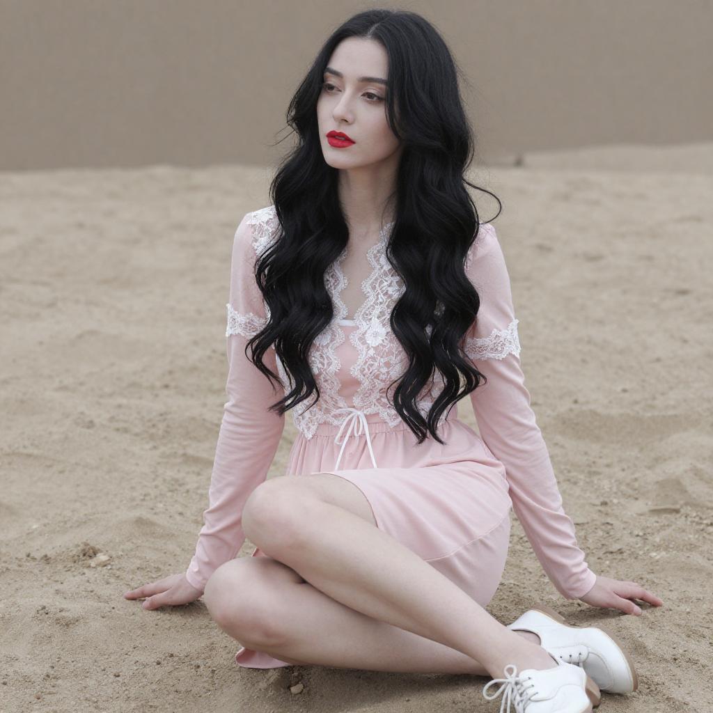 Photograph of a woman with long, wavy black hair and fair skin, sitting on a sandy ground. She wears a pink long-sleeve dress with white lace detailing on the chest and sleeves, and white lace-up shoes. Her red lipstick contrasts with her pale complexion. She gazes slightly to the side with a calm expression. The background features a blurred, ured wall.