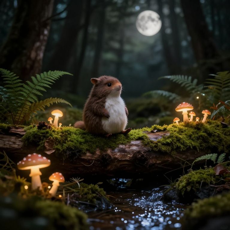 Photograph of a whimsical forest scene at night, featuring a small, brown and white chipmunk standing on a moss-covered log. Surrounding the chipmunk are glowing, red-capped mushrooms with white spots. The background is a dense, dark forest with tall trees and a bright full moon shining through the mist. Ferns and other greenery add texture to the forest floor, which also has a small, reflective puddle. The image combines realistic elements with a magical, fairy-tale-like atmosphere, highlighting the contrast between the dark forest and the bright, glowing mushrooms.