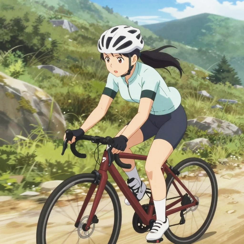 Anime athlete girl cycling on a mountain trail, wind effect in hair, sporty gear with helmet, rugged nature scene, bright daylight, motion blur effect, vibrant anime colors