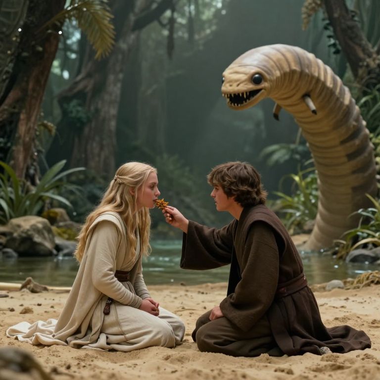 Wide Angle 16:9 full scale figure alia atreides feeding padawan anakin skywalker spice melange sending him into a trance in dagobah swamp while hiding from sandworm that was dropped to hunt them,