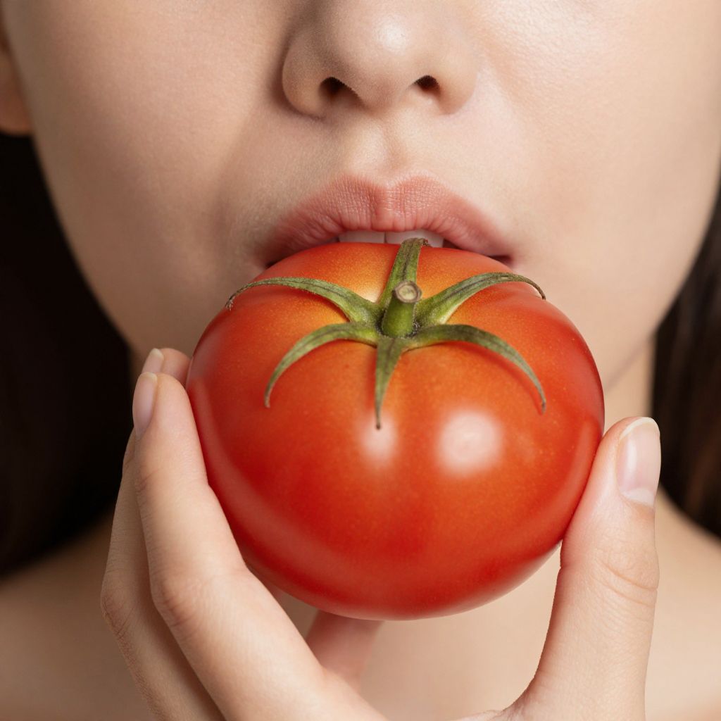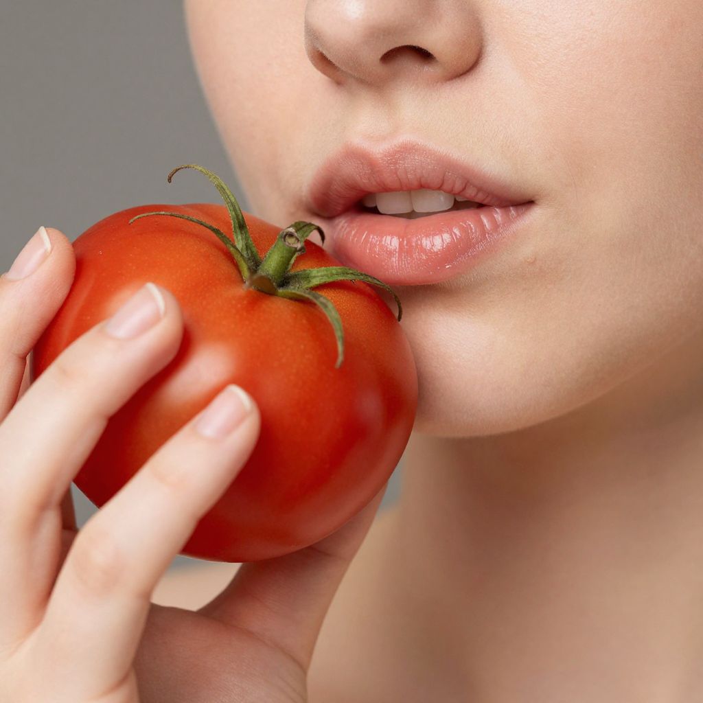 Close-up of a woman's lips and hand holding a vibrant red tomato, showcasing natural beauty and skincare remedies.