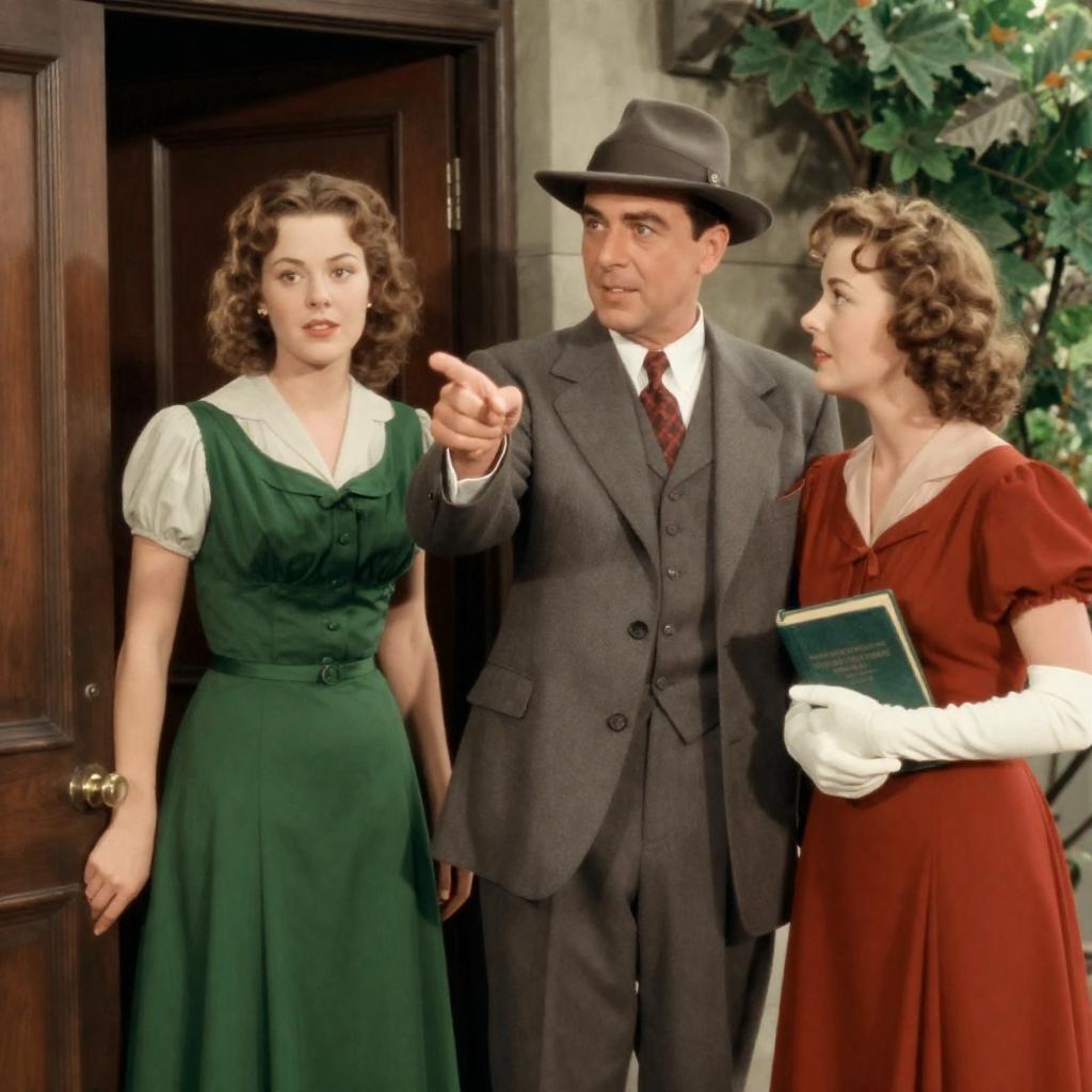 Black-and-white photograph of three people in early 20th-century clothing. Man in left, holding hat, looks at woman in center with elaborate hat, striped dress, and lace collar. Woman on right, in patterned dress, hands out papers. Indoor setting with draped curtains and wooden railing in background. All three look at each other.