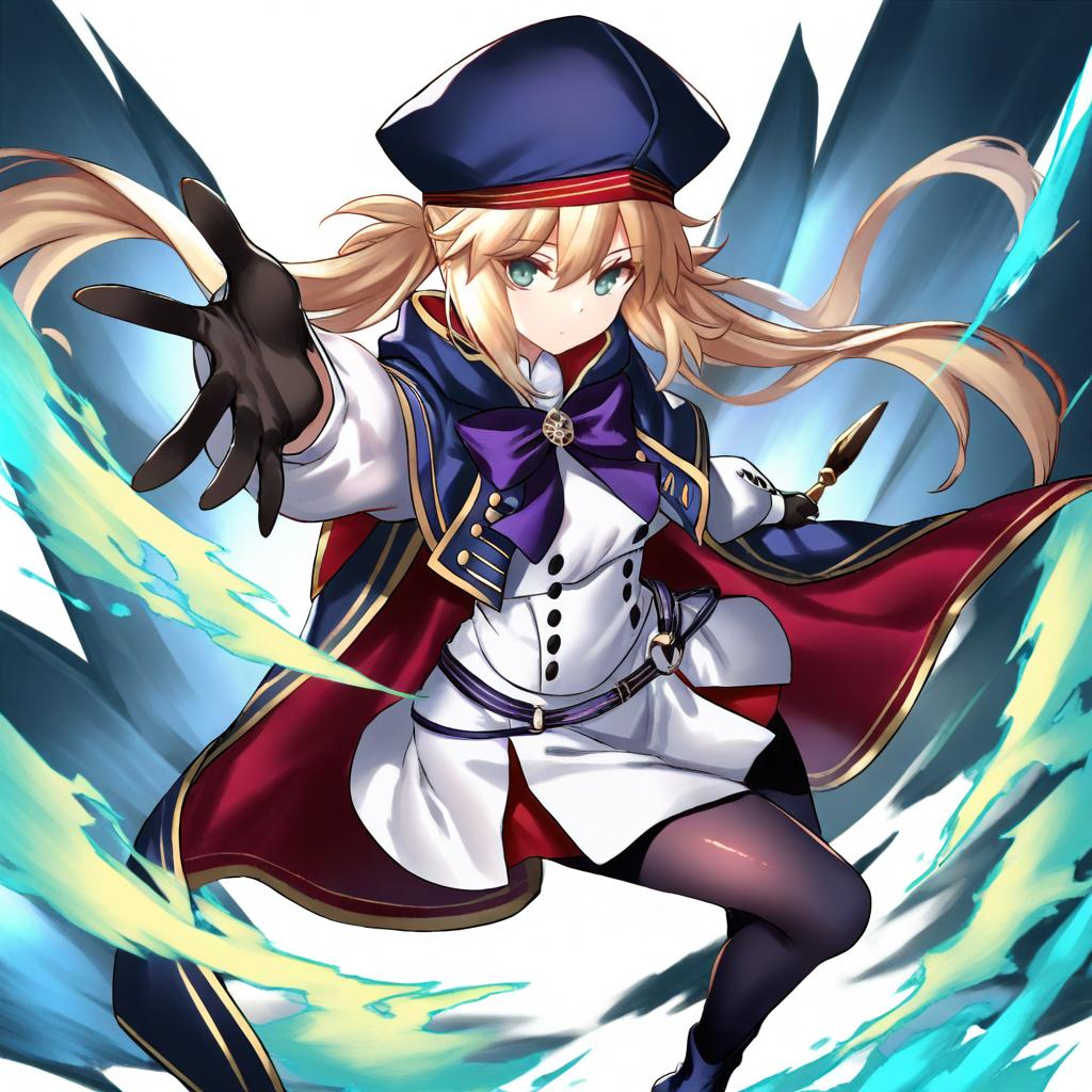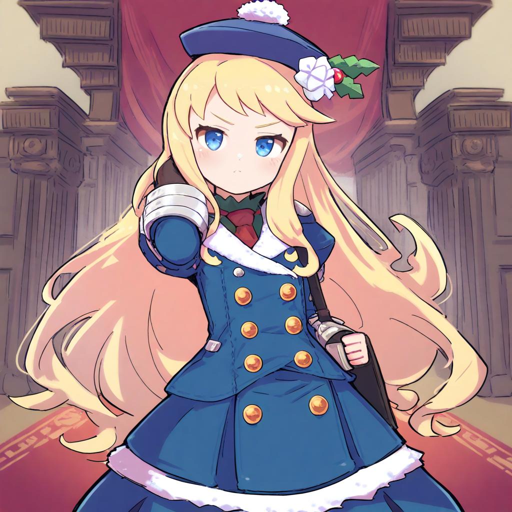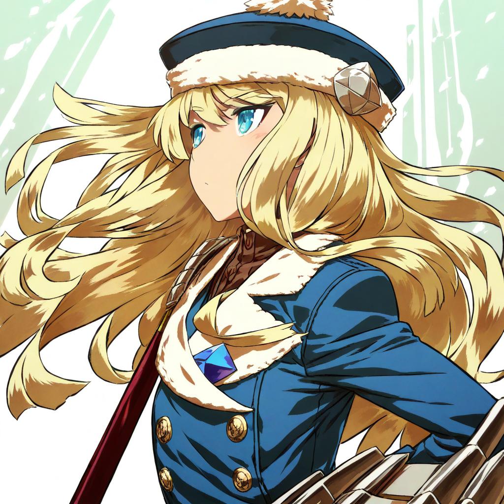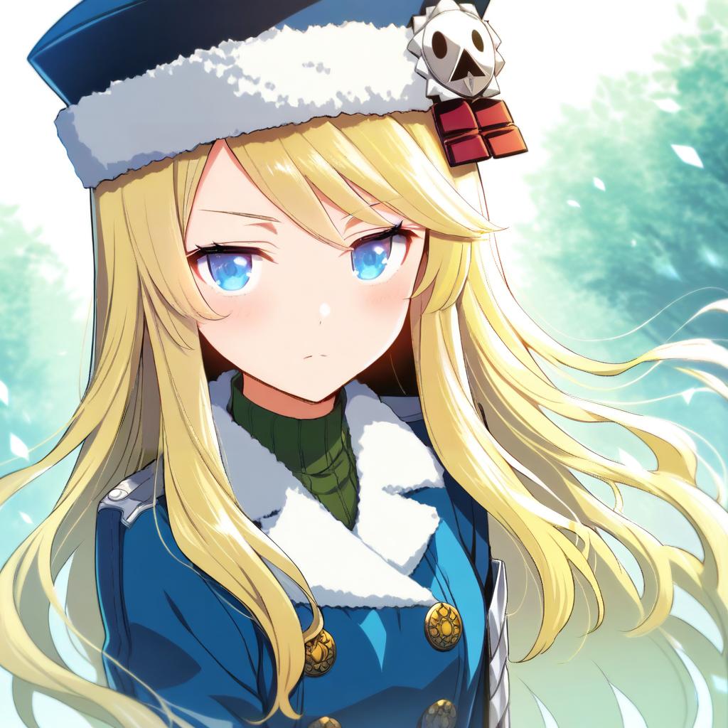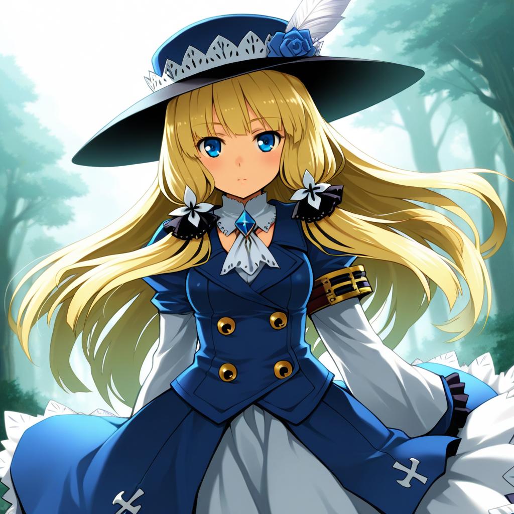 Gunner (sekaiju), sekaiju no meikyuu, 1girl, blue eyes, blonde hair, long hair, hat, by artist haraya manawari, animagine