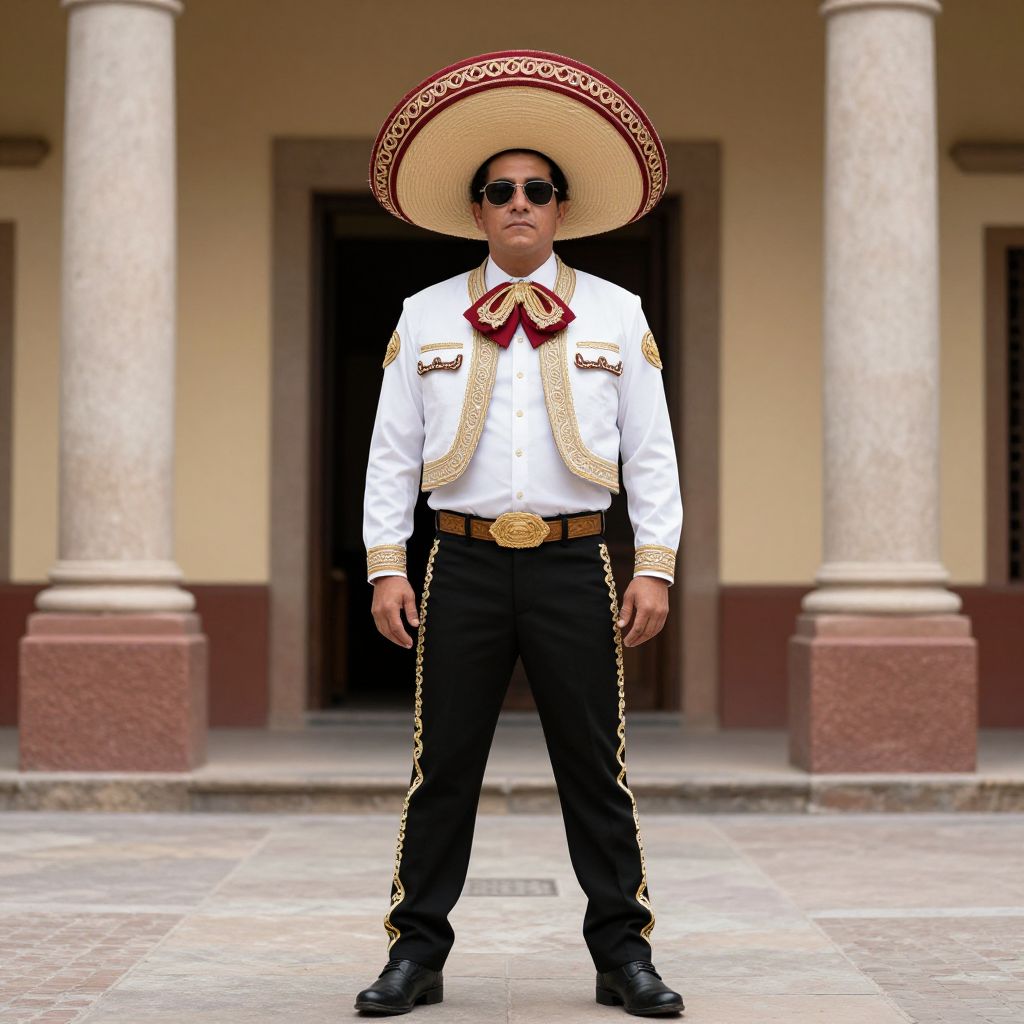 Photograph of a man in traditional Mexican mariachi attire, white shirt with gold embroidery, black pants, wide-brimmed sombrero, sunglasses,