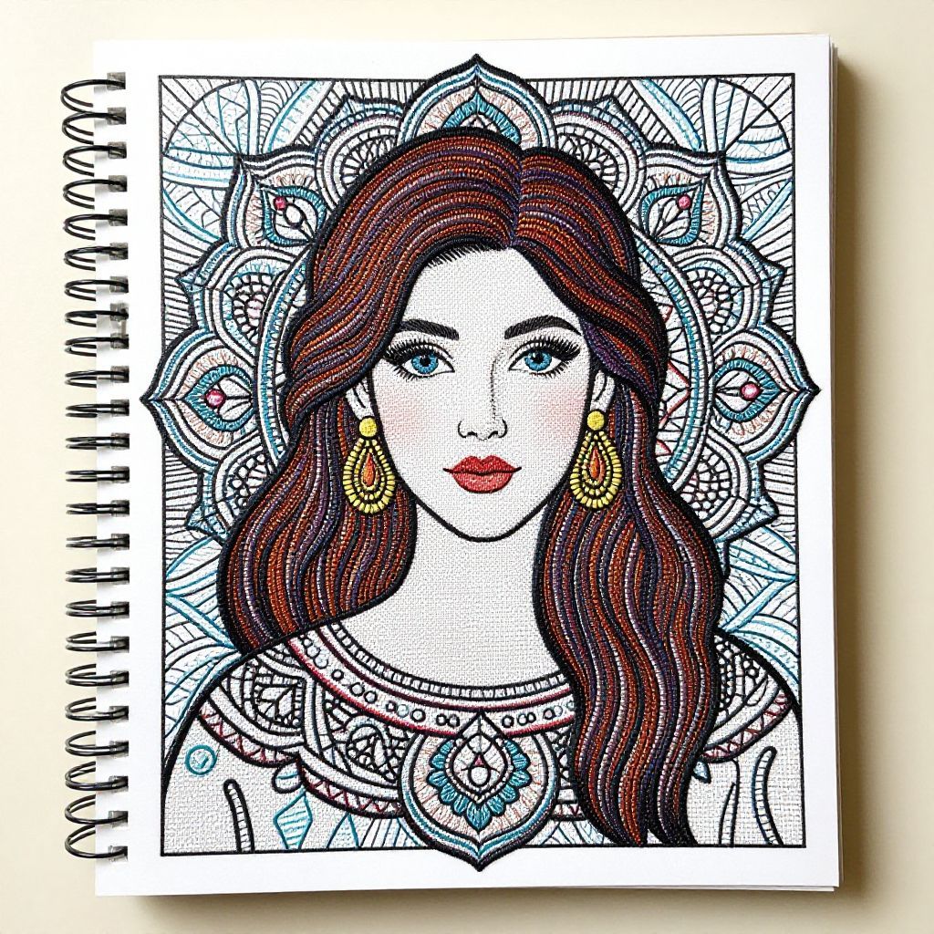 Embroidery Embellishment portrait of beautiful italian woman. Adult coloring book page in mandala style. Cover book painted with colours, no letters,