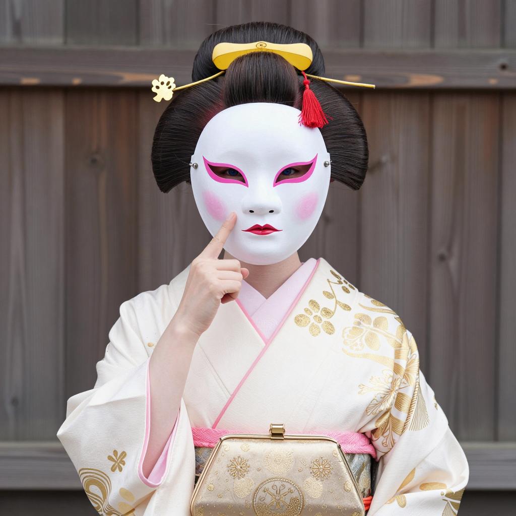Japanese Woman in Traditional Kimono with Umbrella and Fox Mask