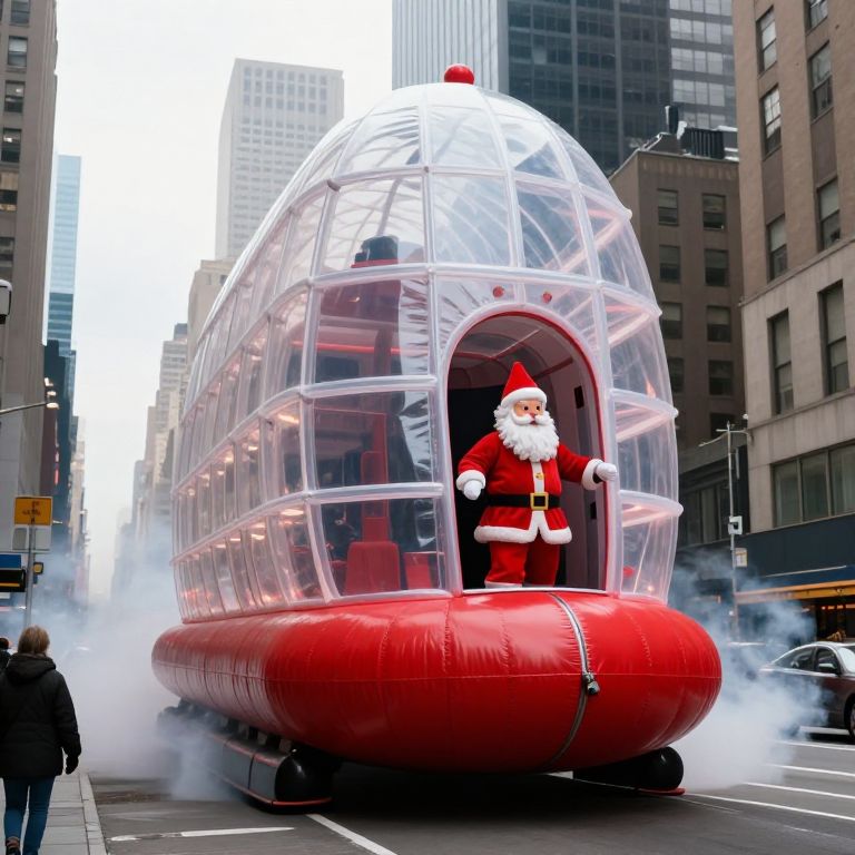 In the heart of New York City, a massive red inflatable hovercraft, designed by Anish Kapoor, dominates the scene. This translucent pvc structure, with its many floors, stands out against the urban backdrop. A large opening in the hovercraft reveals Santa Claus, dressed in a vibrant red suit and hat, emerging onto the street. The smoke billowing from the hovercraft adds a dramatic effect, enhancing the surreal atmosphere. The photograph, taken in the morning light, captures the hovercraft from a frontal perspective in the center of the street, with an orthogonal view of the New York City landscape. The image is a realistic photograph, meticulously detailed and rich in texture, with a resolution of 8k. The scene is dynamic, with Santa's arrival creating a sense of anticipation and wonder in the heart of the city.