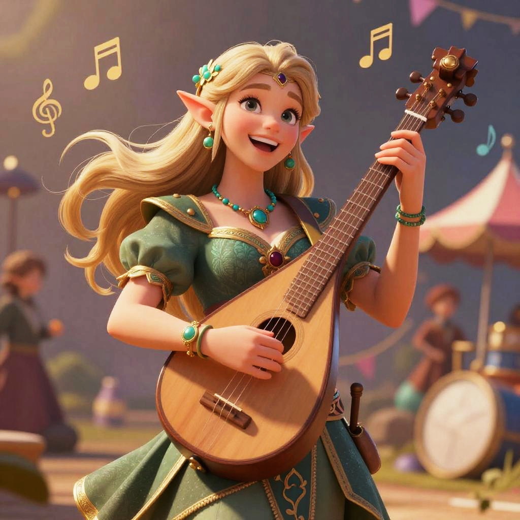 This is a vibrant, digital CGI illustration of a young, blonde, elven girl with pointed ears, playing a wooden lute. She has large, expressive blue eyes, a bright smile, and wears a green dress with gold trim, adorned with a turquoise necklace, earrings, and a headpiece. Musical notes float around her, indicating she is playing music. In the background, there is a blurred, circus-like setting with a drummer and other musicians, and colorful tents. The scene is brightly lit with warm sunlight, enhancing the cheerful, fantasy atmosphere.