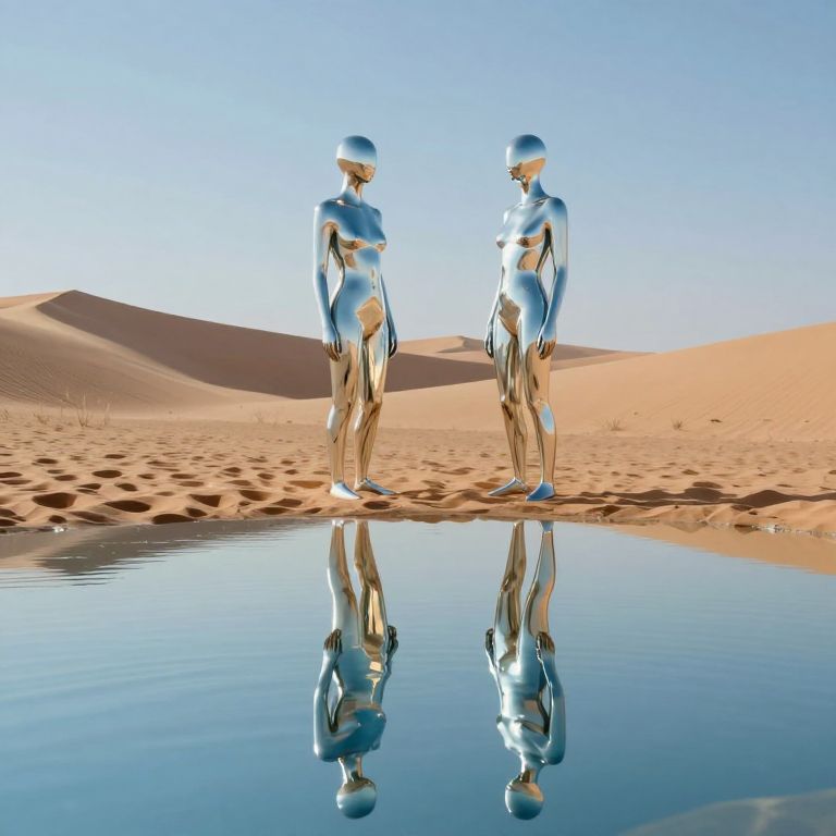 In a surreal desert landscape, two mirrored figures stand beside a tranquil oasis, their reflections shimmering in the water below, evoking a dreamlike, cyberpunk-inspired atmosphere where reality blurs with memory and reflection.