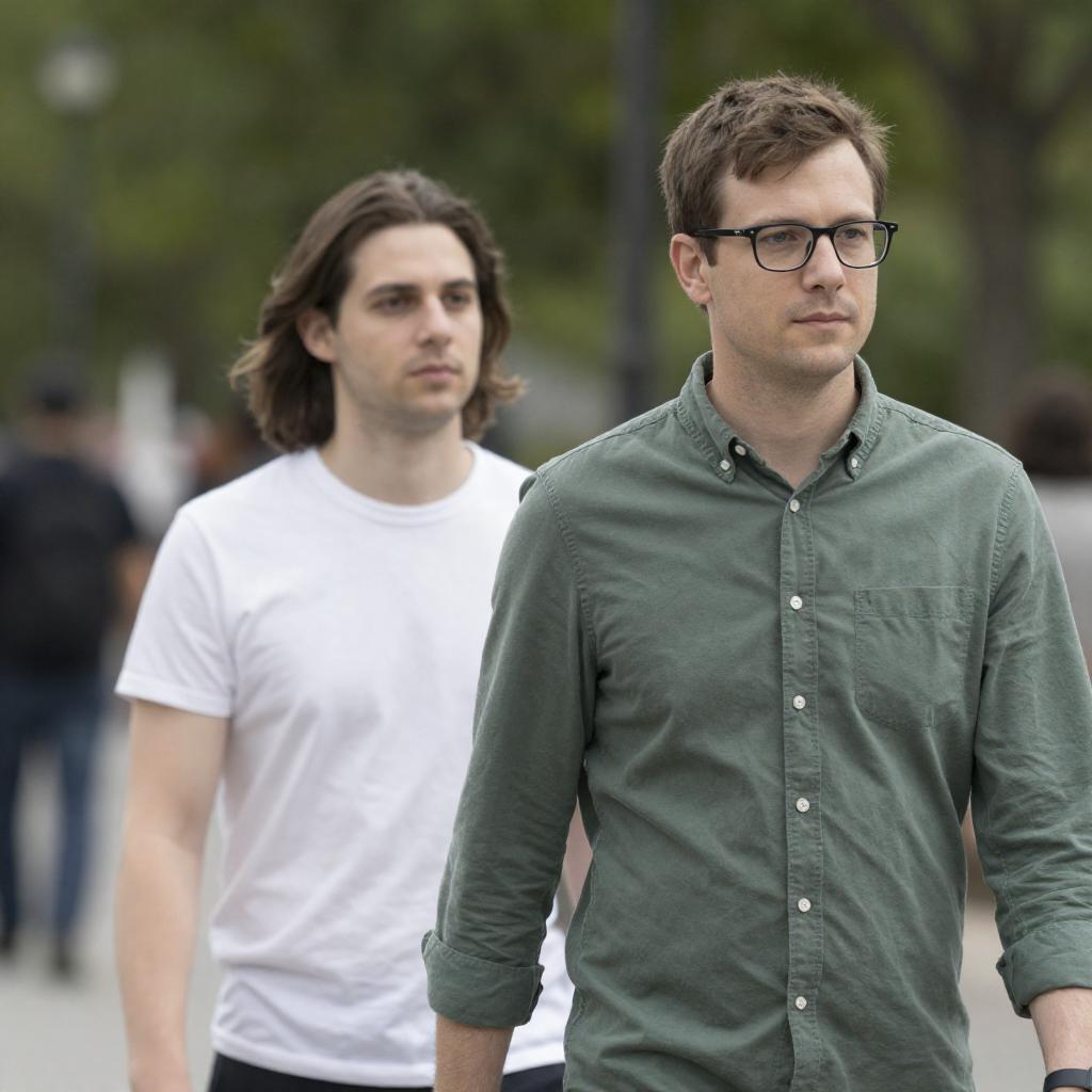Photograph of two men walking outdoors. The man in the foreground has short brown hair, glasses, and wears a green button-up shirt. The man behind him has long brown hair, a white t-shirt, and looks over his shoulder. Blurred green trees and people in the background.