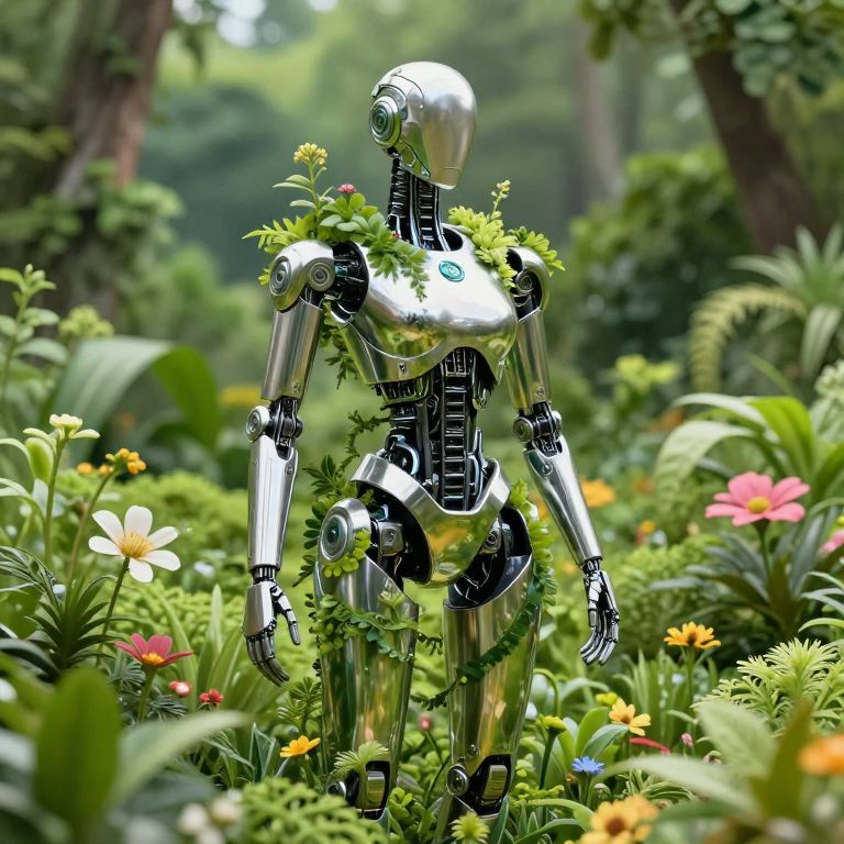A futuristic robotic figure stands gracefully amidst a lush, verdant landscape, entwined with plants and flowers. The sleek metallic body reflects the surrounding nature, emphasizing a harmonious blend of technology and the environment. This artwork captures a vision of ecological balance and innovation, showcasing a unique style of digital art with a focus on intricate details and vibrant colors.