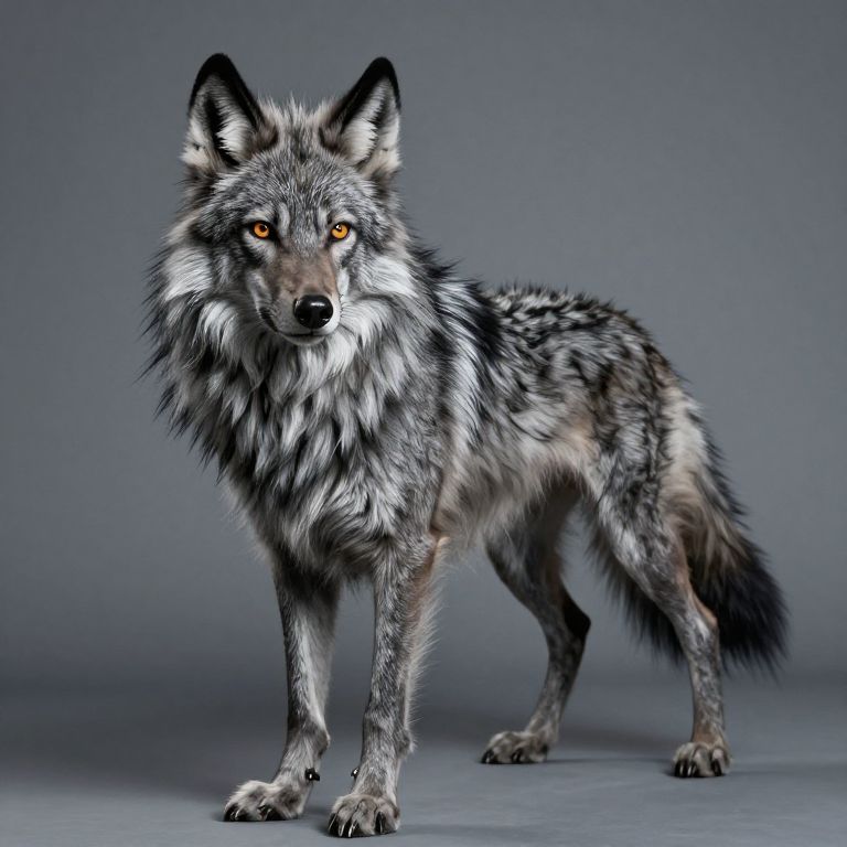 Photograph of a realistic CGI-rendered gray wolf standing against a plain, gradient gray background. The wolf has a thick, bushy coat with a mix of gray, black, and white fur, and piercing yellow eyes that gaze directly at the viewer. Its ears are erect, and its facial expression is alert. The wolf's legs and paws are muscular, with sharp claws visible. The fur texture appears detailed and realistic, with individual strands and shadows adding depth. The overall lighting is soft, highlighting the wolf's natural colors and textures.