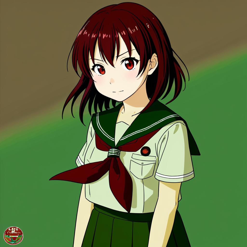 Mutsuki kai ni (kancolle), kantai collection, 1girl, red eyes, brown eyes, short hair, brown hair, gradient hair, red hair, serafuku, serafuku, green skirt, pleated skirt, green sailor collar, crescent pin, red neckerchief, by artist kibanda gohan, anime
