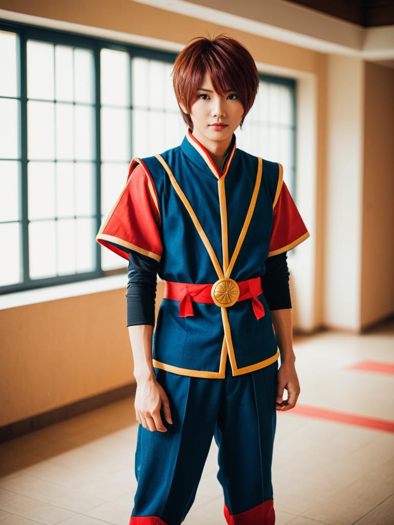 Photo-realistic cosplay photo of person standing in morisawa chiaki costume. 1boy, brown eyes, hair between eyes, red eyes, brown hair, short hair, long sleevesfull body shot. lifestyle stock photo, shallow depth of field, lifestyle stock photography, shallow depth of field, natural lighting, warm tones, soft background blur, vibrant colors, realistic textures