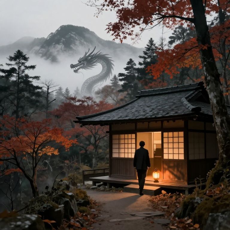 Envision an autumnal forest landscape reminiscent of traditional Japanese ink paintings, with a majestic dragon subtly emerging from fog-shrouded mountains in the background. The perspective shifts to reveal a quaint cabin nestled among the trees, its warm light casting shadows through delicate paper windows and illuminating the path leading up to it. As the camera slowly zooms in on the entrance, a mysterious figure adorned in an antique suit can be seen exiting the cabin, leaving behind a glowing, old-fashioned lantern emitting a soft orange hue. The image captures both the serene tranquility of the natural surroundings and the enigmatic presence of the stranger, creating a sense of wonder and intrigue that lingers long after viewing.