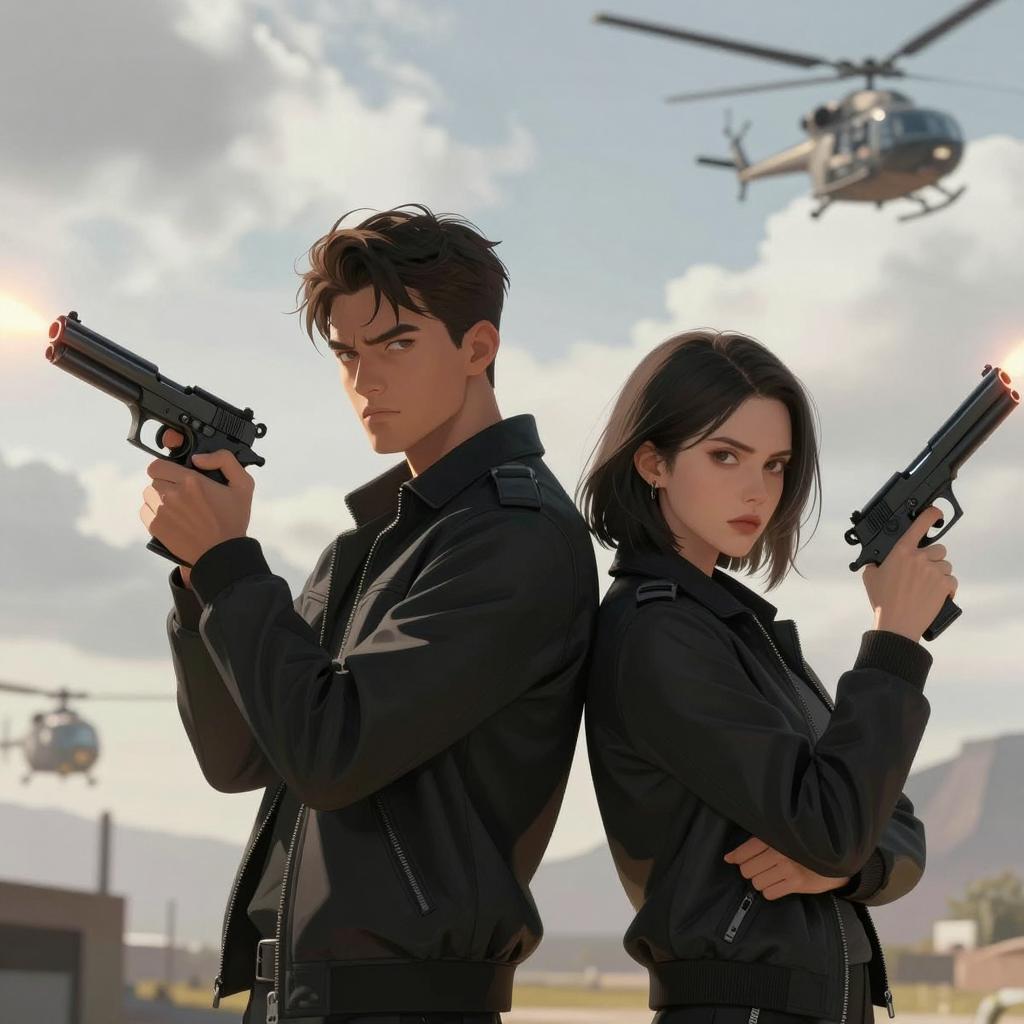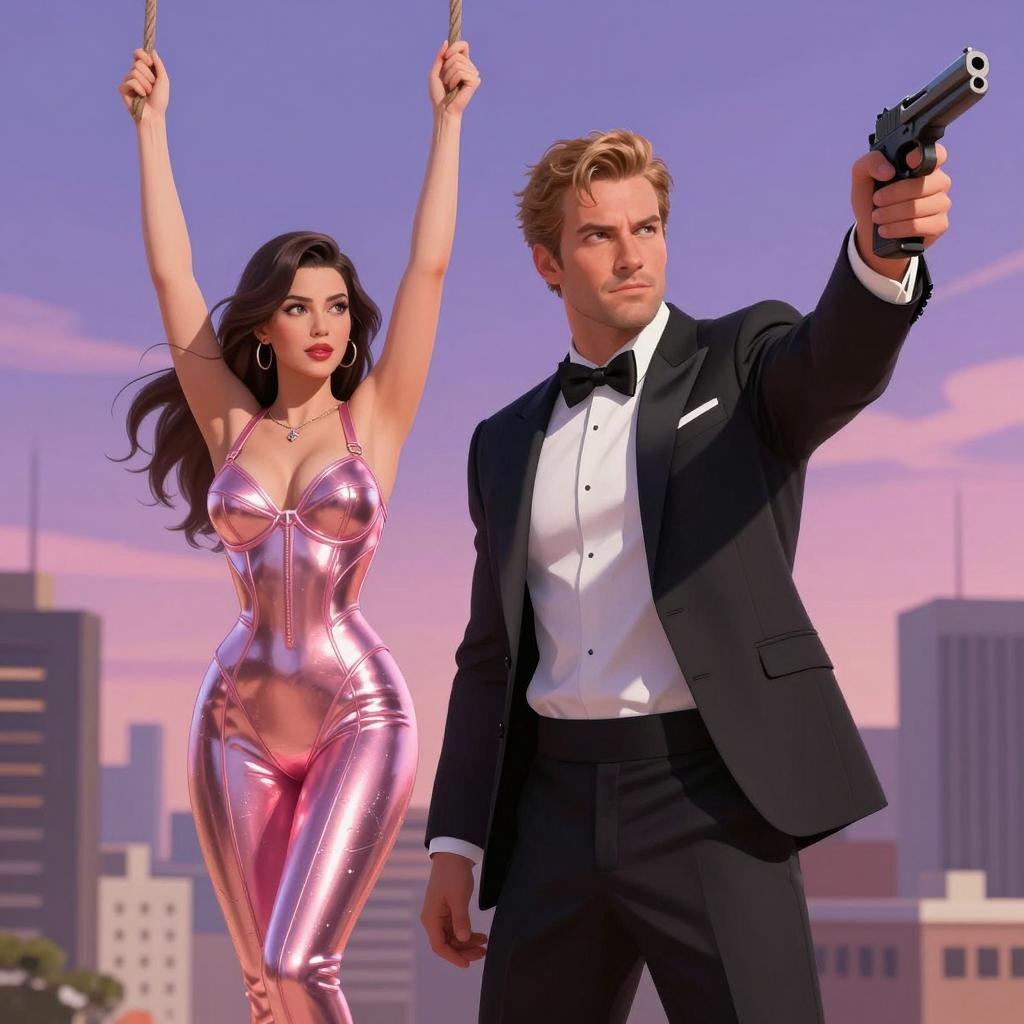 Illustration of a man in a black tuxedo with a bow tie, pointing a gun forward, right arm raised. To his left, a woman in a revealing, metallic pink outfit, suspended by ropes, arms raised. Purple and pink sky background, cityscape below. Both characters have intense expressions. Man has light brown hair, woman has dark brown hair. Two people.