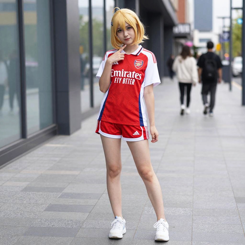 Young woman wearing an Arsenal football club cosplay outfit, including a red and white jersey and matching shorts, posing outdoors on an urban sidewalk. She has a short blonde wig and white sneakers, with a blurred city street background featuring pedestrians and buildings.