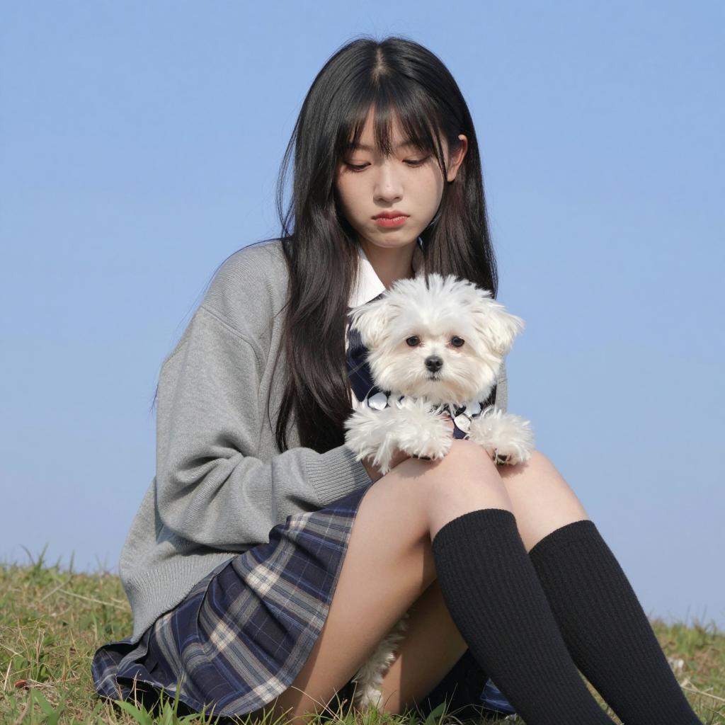 Asian girl with long black hair, sitting on grass, wearing a gray cardigan, plaid skirt, and black knee-high socks. She holds a small white dog, looking down with a neutral expression. Clear blue sky in the background. Number of people: 1.