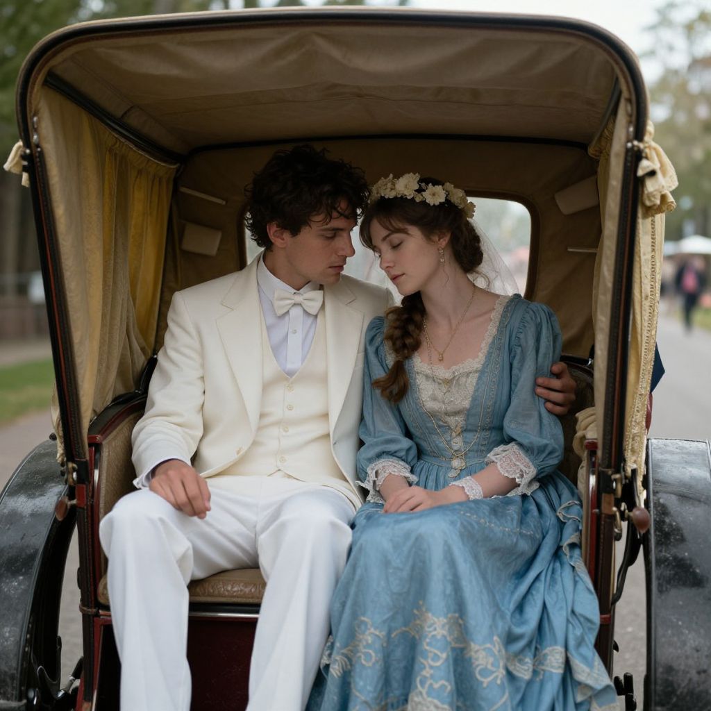 In this evocative scene, two individuals, possibly lovers, sit in the back of a vintage carriage, their expressions and body language hinting at a deep emotional connection. The man, dressed in a crisp white suit with a bow tie, gazes downward, his face etched with a mix of contemplation and longing. Beside him, the woman, adorned in a flowing blue dress with intricate lace details and a delicate floral headpiece, leans towards him, her eyes closed as if lost in thought or a moment of intimacy. The carriage interior, with its yellow curtains and ornate wooden details, adds a rustic charm, while the soft blur and veils of light suggest a dreamlike quality. The overall composition, with its soft focus and rich, muted colors, evokes a sense of nostalgia and fantasy, reminiscent of Jodorowsky's \"The Holy Mountain.\" The scene is imbued with a sense of movement and emotion, capturing a fleeting moment of romance and introspection.
