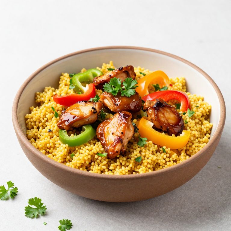 Vibrant bulgur wheat bowl topped with glossy date chicken pieces, colorful bell pepper slices, and fresh parsley leaves, served in a rustic ceramic dish with a brown rim, set against a minimalist background with scattered green herbs.