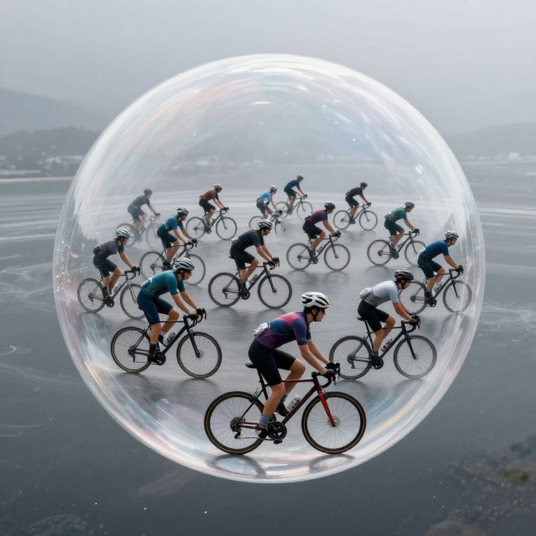 Photograph of cyclists inside a large, transparent bubble on a foggy racetrack; cyclists wear helmets and spandex, creating a surreal, reflective