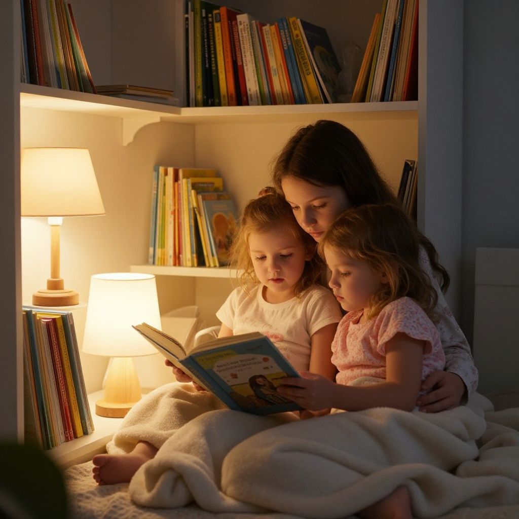 Prompt for girls kids: A bedtime story corner with a girl reading a soft book to a younger sibling, warm lamp light, cozy blanket, bookshelf full of colorful children's books, peaceful and serene, emotional connection, gentle realism.