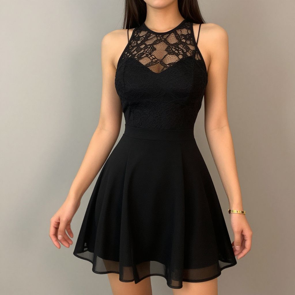Photograph of a young woman with long, straight black hair, wearing a sleeveless, black lace halter dress that features a sheer lace pattern over the chest and solid black fabric below. The dress has a fitted bodice and a flared, knee-length skirt. She has light skin and is standing against a plain, light gray background. Her left wrist is adorned with a simple gold bracelet. The image focuses on the upper half of her body, from neck to mid-thigh. The lighting is even, highlighting the texture of the lace and the smoothness of the fabric.