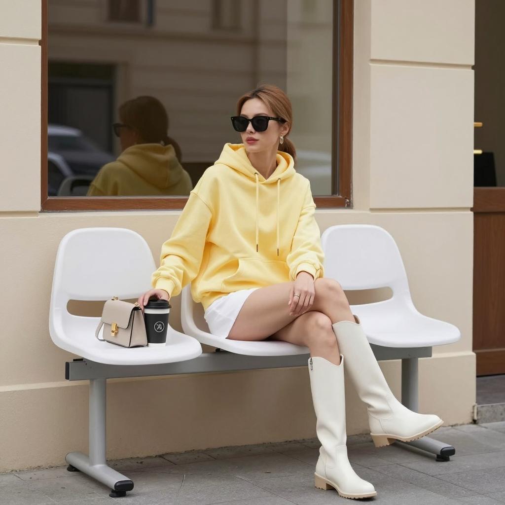 Woman sitting on a wooden park bench, drinking from a cup. Long brown hair, black beret, sunglasses, black jacket, black skirt, black knee-high boots. Light brown handbag on the bench. Cobblestone ground, beige wall, white-framed window. Right arm resting on bench, left leg crossed over right. Intense sunlight on face.