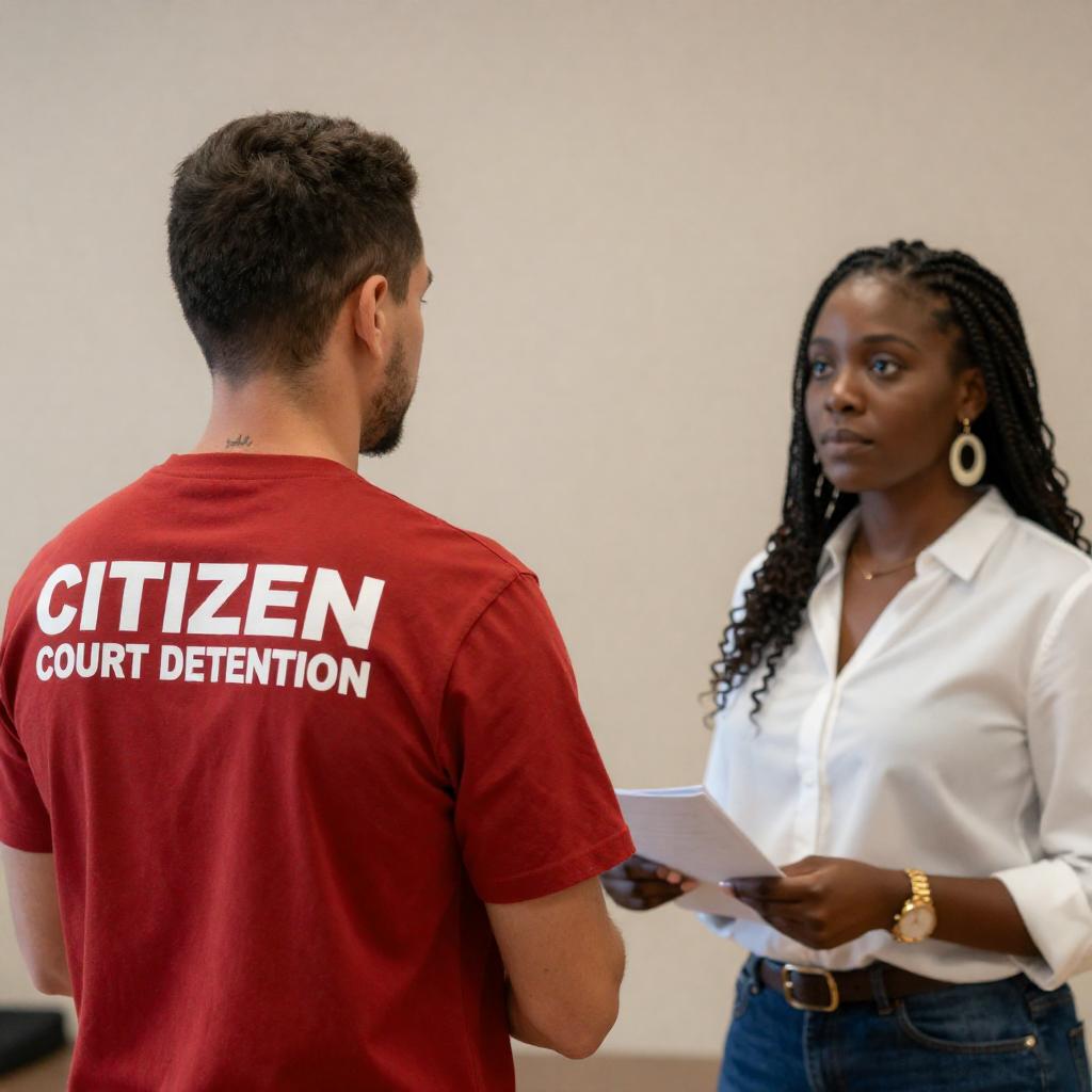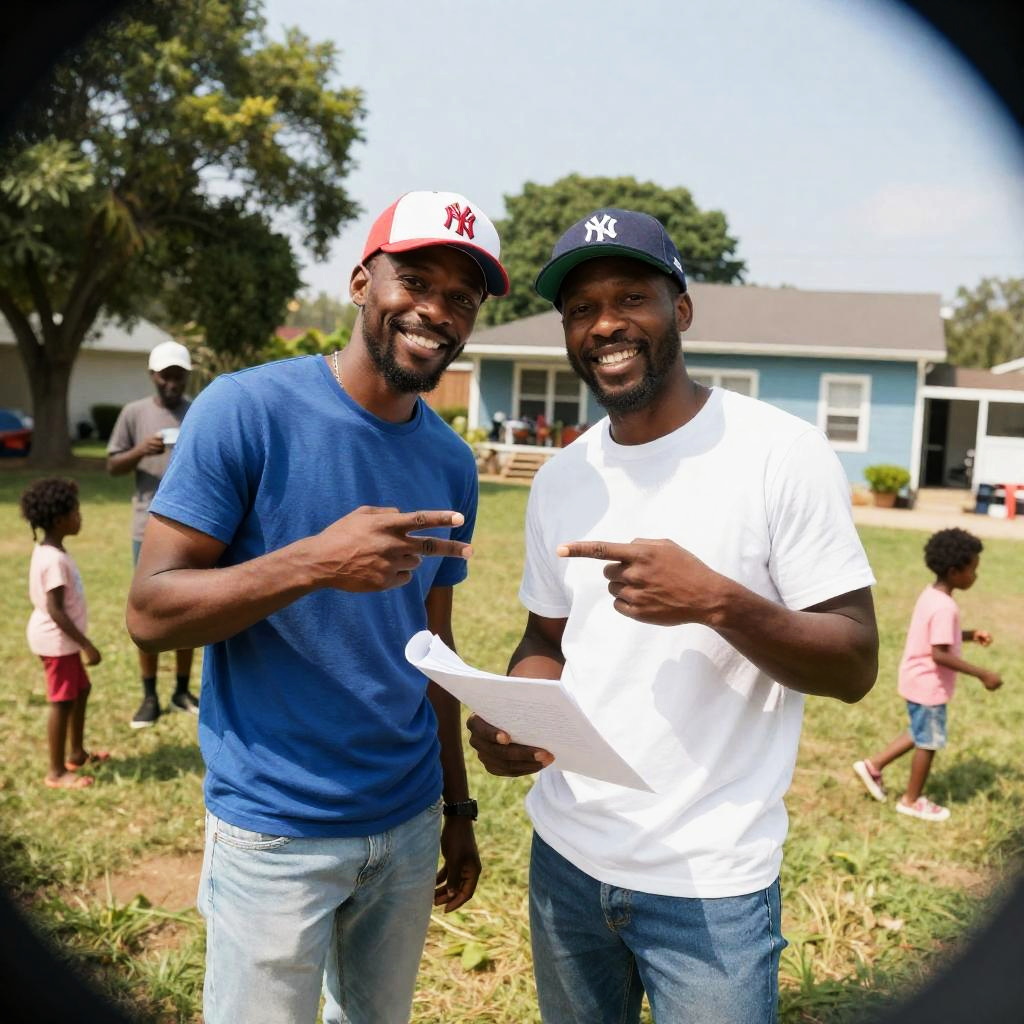 Photograph of a crowded indoor gathering. Central figures: black man in blue shirt shaking hands with Asian man in glasses, red headband. Blonde woman in beige shirt holds small girl in white shirt. Background: diverse group, red and white striped wall. Intense, focused expressions.