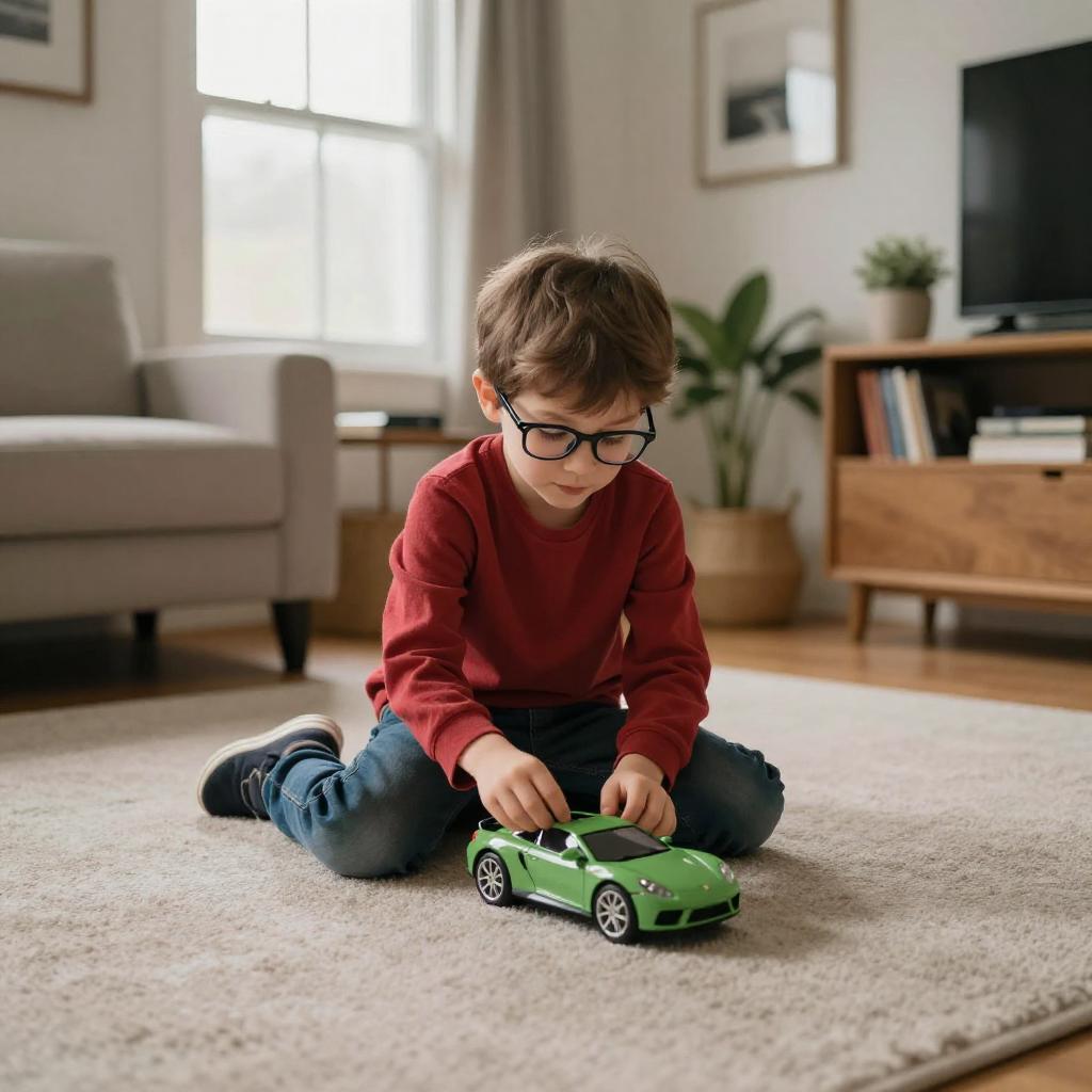 A young boy wearing glasses and a red long-sleeve shirt is sitting on a carpeted floor in a living room, playing with a green toy car. The room is softly lit with natural light from a large window in the background. The living room features cozy furniture, including armchairs and a bookshelf with a television on top.