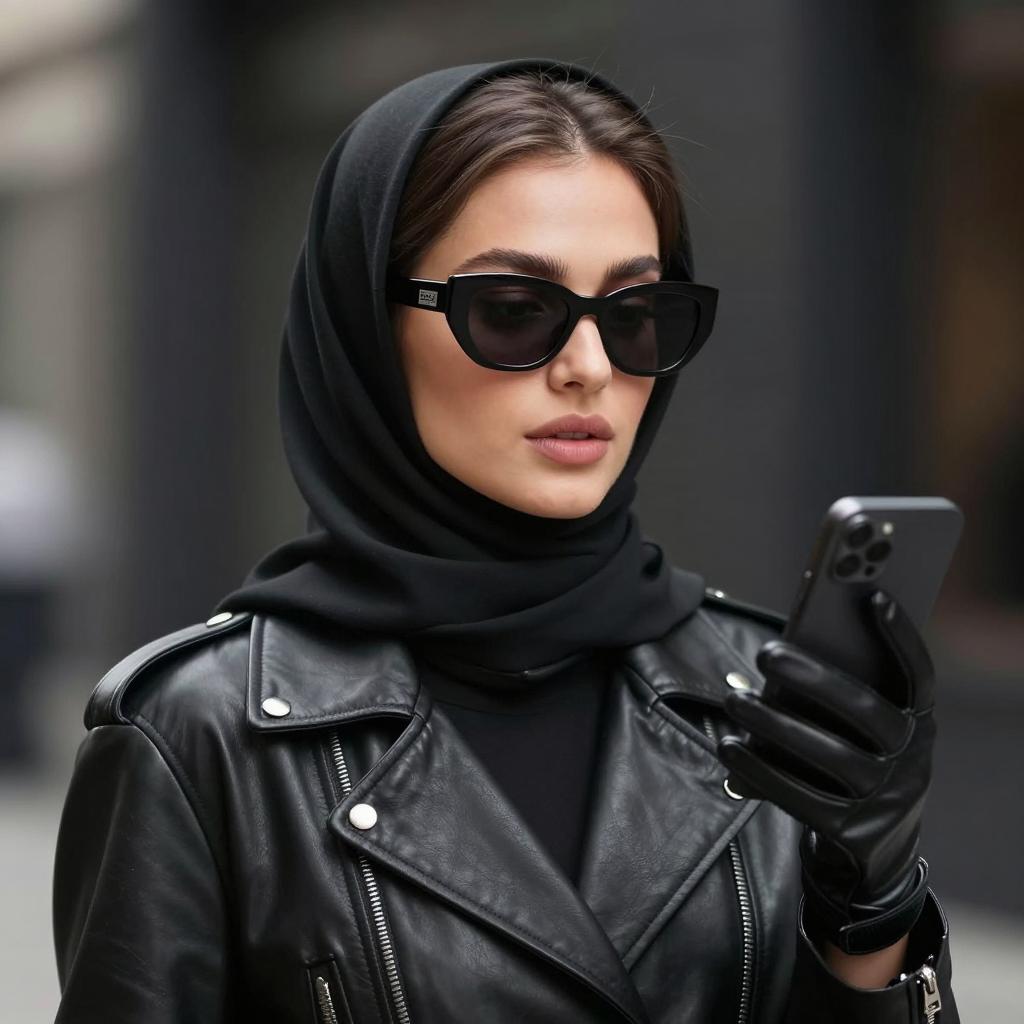 Close-up portrait of a woman with light skin and brown hair wearing a black leather hijab, black leather jacket, black leather gloves, and dark sunglasses. She holds a black smartphone in her gloved hand against a blurred dark background. The woman has a neutral expression and a modern, edgy style.