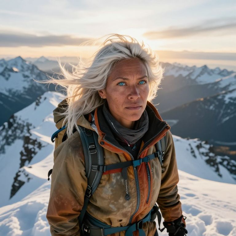 Imagine a captivating portrait photo of a Pacific Islander female adventurer with striking ice-blue eyes and windswept platinum hair. Captured from an unexpected aerial angle, she stands atop a snow-capped mountain peak under a dramatic sky, her intense expression illuminated by a soft golden glow emanating behind her. This light delicately highlights the rugged lines on her face, etched by years of exploration, while also revealing intricate details of her weathered attire—a unique blend of vintage ski gear and modern outdoor equipment that symbolizes her determination and resourcefulness. The ultrarealistic portrait evokes emotions ranging from awe to admiration and a shared sense of triumph, inviting viewers into an immersive journey through the untamed landscapes of her experiences.