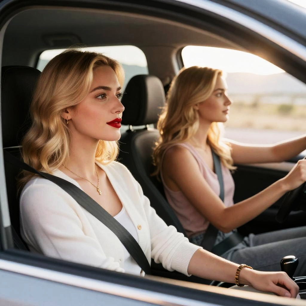 Photograph of a blonde woman with light skin, blue eyes, and bangs, smiling softly while driving a car. She wears a light blue sleeveless top and holds the steering wheel with both hands. The car's interior is beige with leather seats.